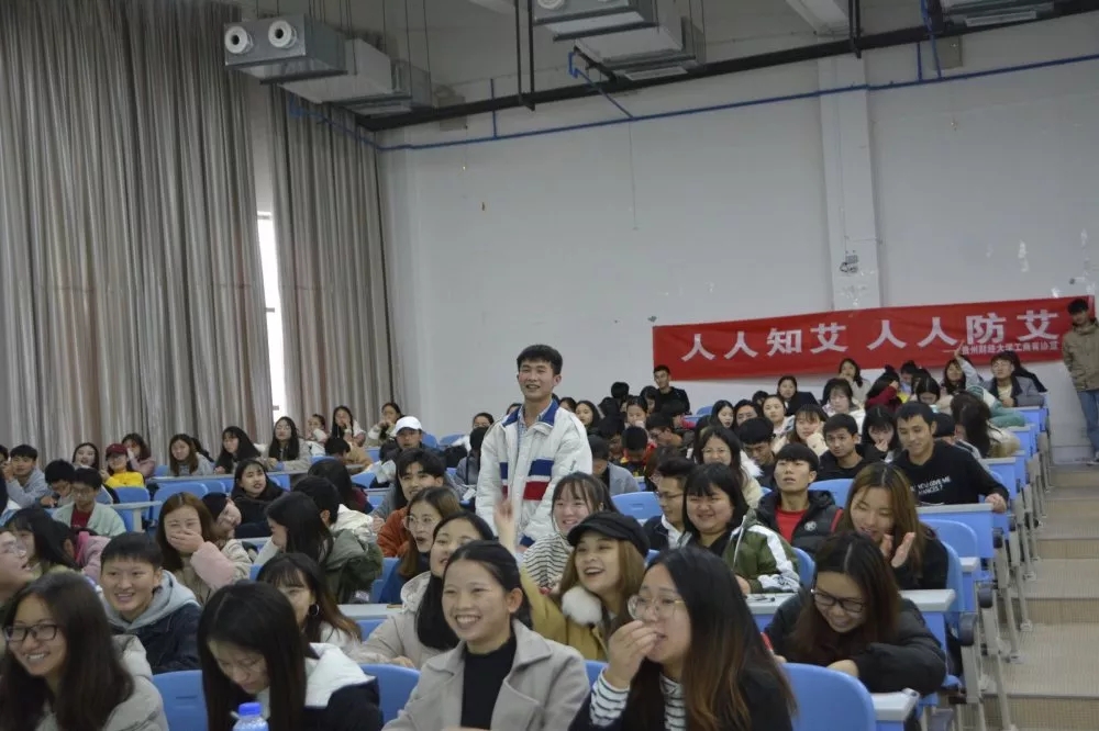 为吸引同学们踊跃参与防艾知识竞赛、宣讲会,11月23日工商青协于五四广场进行防艾线下宣传。26日下午13时许,大会在主讲人苏浩鹏风趣幽默的自我介绍中拉开序幕,在宣讲会中主讲人讲到:什么是艾滋病?艾滋病有哪些传播途径?我们老员工该怎样预防艾滋病?感染了艾滋病怎么办?我们应该如何正确对待艾滋病患者?对于预防艾滋病我们青少年能做些什么?通过一系列问题来让同学们对艾滋病以及艾滋病的防范有了进一步了解。现场互动与激励的问答环节使同学们从不同的层面去了解了艾滋病,也提高了同学们对艾滋病的认知。