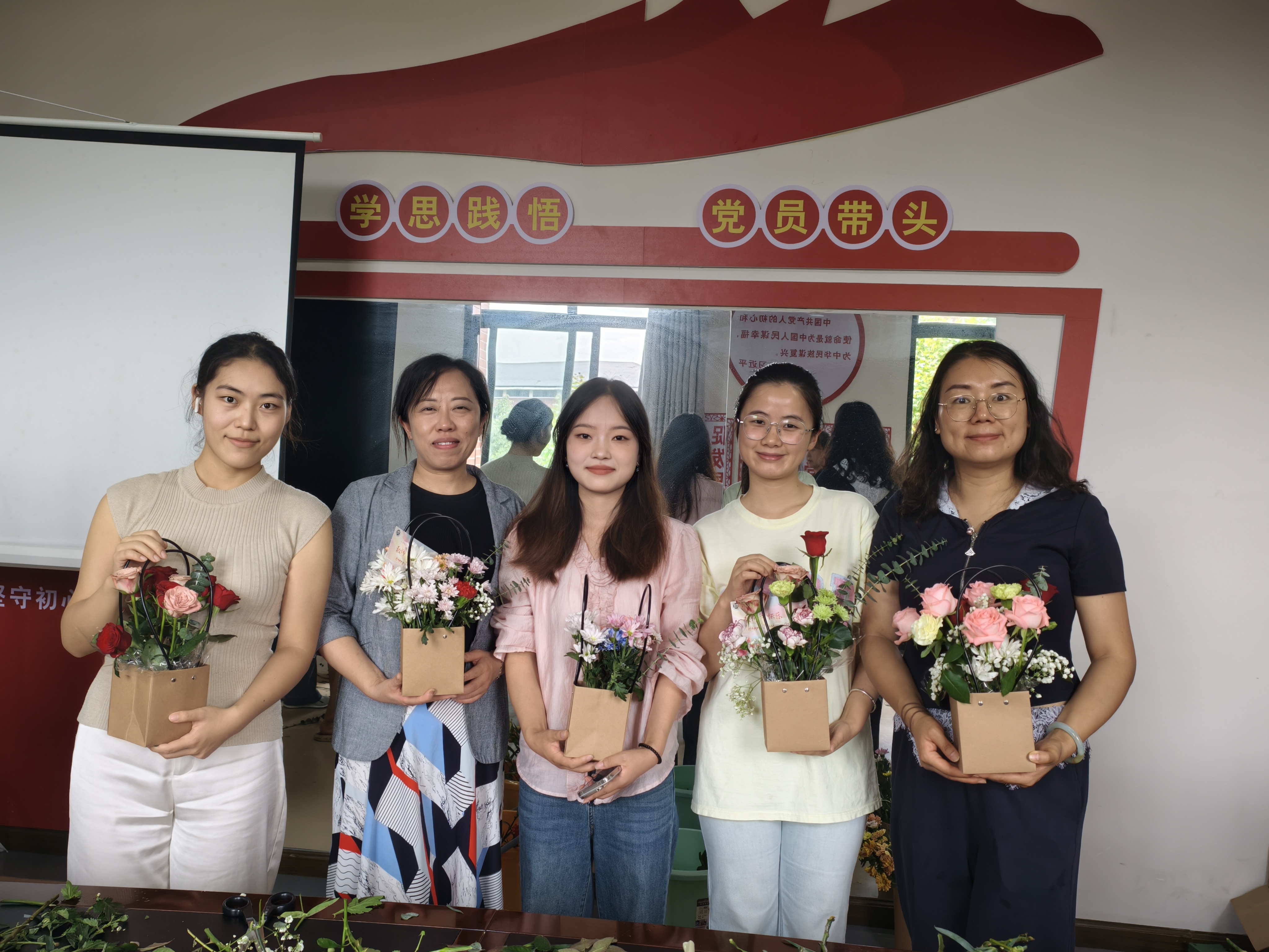 活动中,员工党员分组完成花材选购、艺术插花、贺卡设计等环节,精心制作个性化花艺作品。从花卉品种选择到色彩搭配,师生共同探讨插花技艺,现场气氛温馨融洽。教师们手持专属手作花束和祝福卡片,纷纷表示不仅收获到节日仪式感,同时感受到党组织的关怀与温暖,进一步增强了教育工作的荣誉感与幸福感。