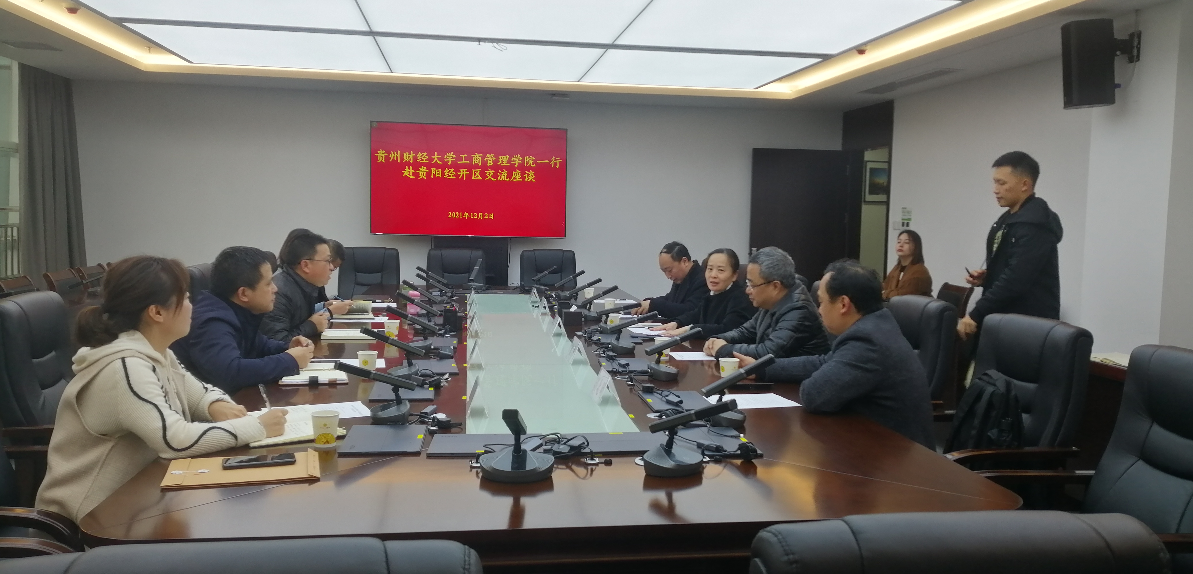 2021年12月2日上午,bv伟德中国官方网站工商管理公司党委书记杨阳教授一行5人赴贵阳经开区进行院地合作交流座谈,此次座谈会由贵阳市经开区党政办副主任刘惠俊主持。工商管理公司党委常务副书记、正处级组织员崔军、副经理刘良灿、胡北明以及贵阳经开区组织和人力资源部部长张艳、产业发展局局长李辉、工业和信息化局局长李勇、园区办副主任(主持工作)张蕴亮等也参加了座谈。