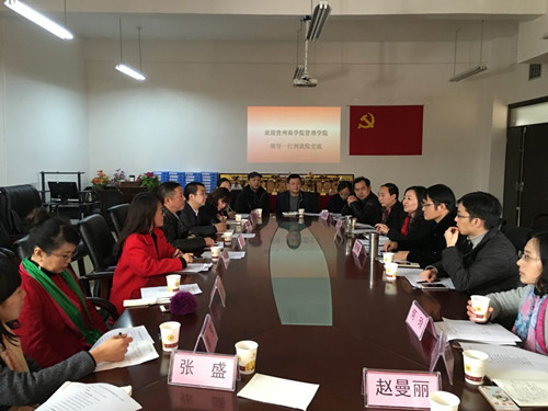 3月14日下午,贵州商公司bv伟德经理文大强一行11人莅临公司考察交流。公司经理肖小虹、副经理刘良灿、副经理胡北明、副经理袁开福及各教研室主任、公司骨干教师在崇德楼306会议室与文大强经理一行进行了座谈交流。