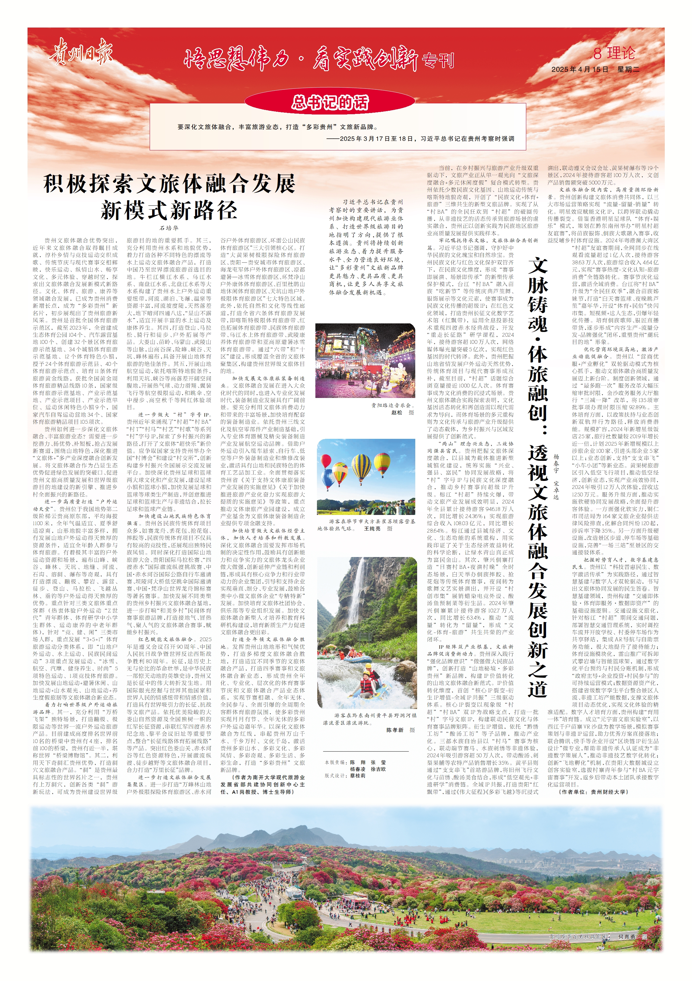 近日,公司bv伟德杨春宇教授在《贵州日报(理论版)》发表题为《文脉铸魂·体旅融:透视文体融合发展创新之道》。2024年以来,杨春宇教授立足贵州打造世界级旅游目的地的发展目标,多次接受贵州日报、贵州广播电视台等主流媒体采访,围绕文旅体深度融合、旅游产业化创新路径等议题发表专业见解,为贵州省旅游高质量发展提供理论支撑与实践指引。
