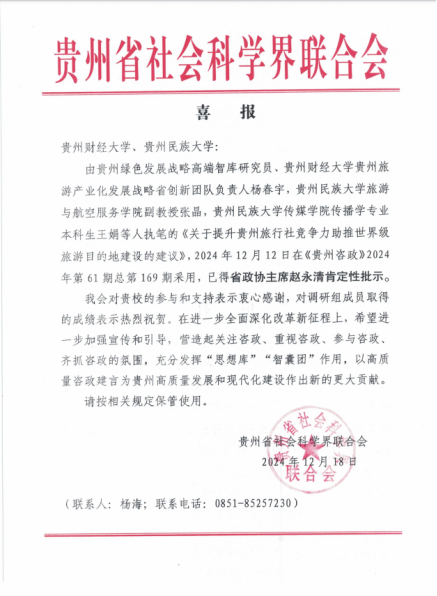 公司bv伟德杨春宇教授等人执笔的《关于提升贵州旅行社竞争力助推世界级旅游目的地建设的建议》,2024年12月12日在《贵州咨政》2024年第61期总第169期采用,已得省政协主席赵永清肯定性批示。公司将继续充分发挥“思想库”“智囊团”作用,做好旅游人才培养工作,支持贵州文化和旅游高质量发展、助力贵州在新时代西部大开发上闯新路。