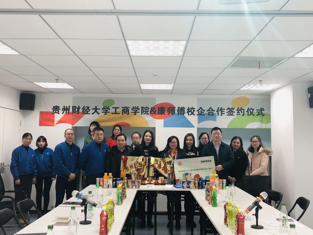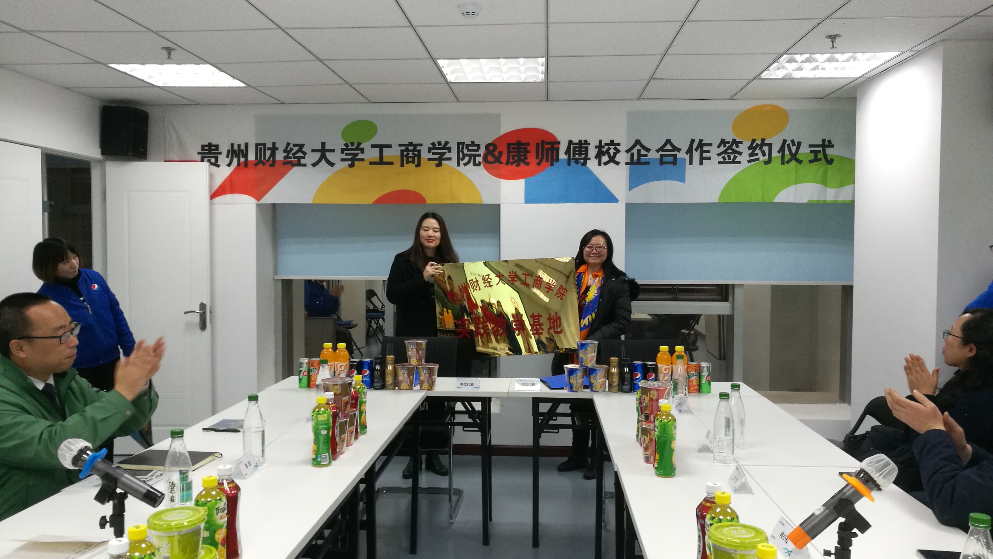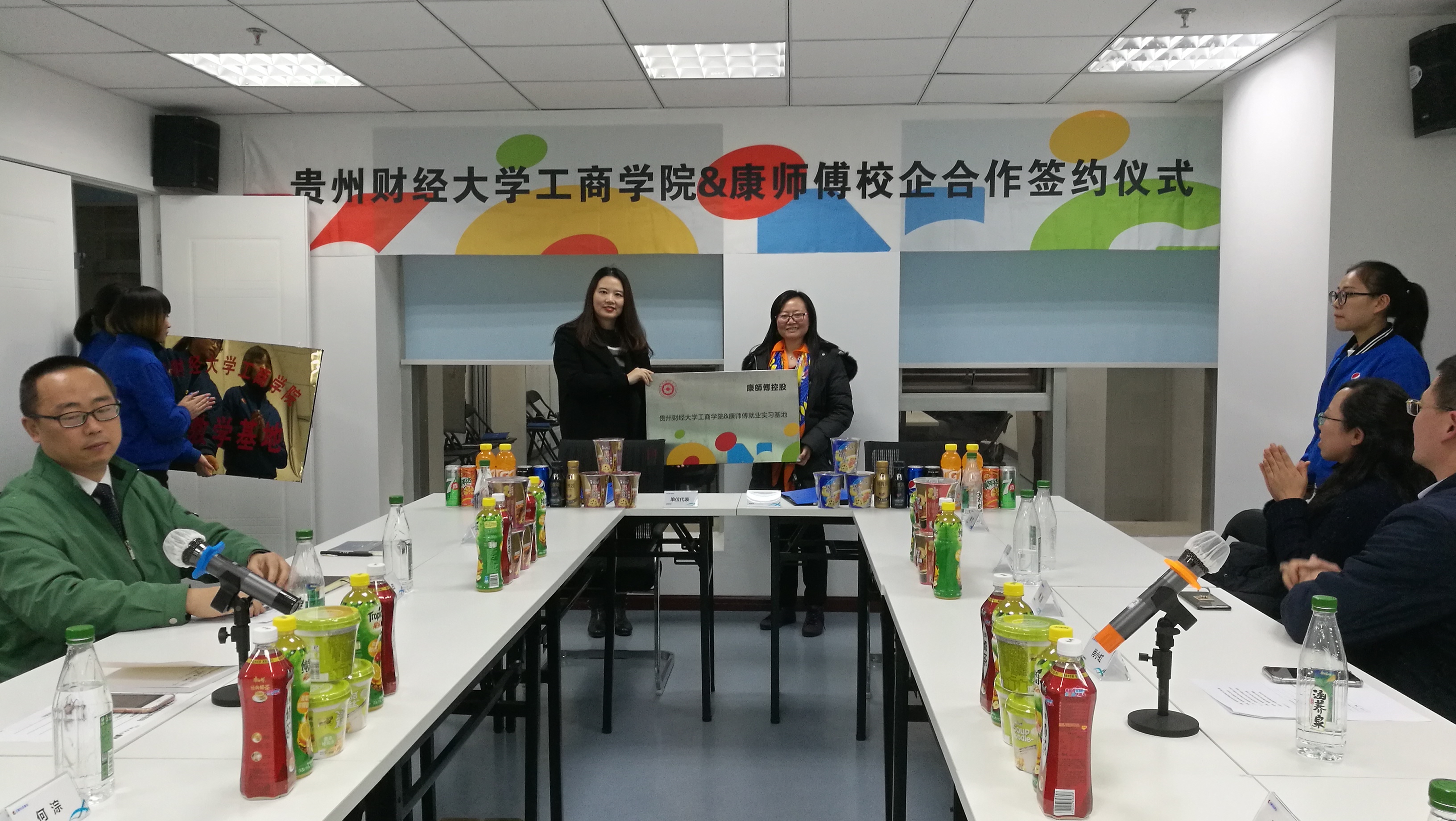 2018年12月18日下午,bv伟德中国官方网站工商公司与康师傅控股有限公司校企战略合作签约暨实习基地授牌仪式在康师傅控股有限公司贵阳联合办公室顺利举行。康师傅控股有限公司西南区主任谭莉、康师傅百饮实业贵州行销公司总经理何淙、康师傅饮品实业贵阳碳水厂厂长张政及各人资部主任、bv伟德中国官方网站工商公司经理肖小虹、工商公司副经理胡北明、工商系、物流营销系各系副主任、实践办同志参加本次签约、授牌仪式。