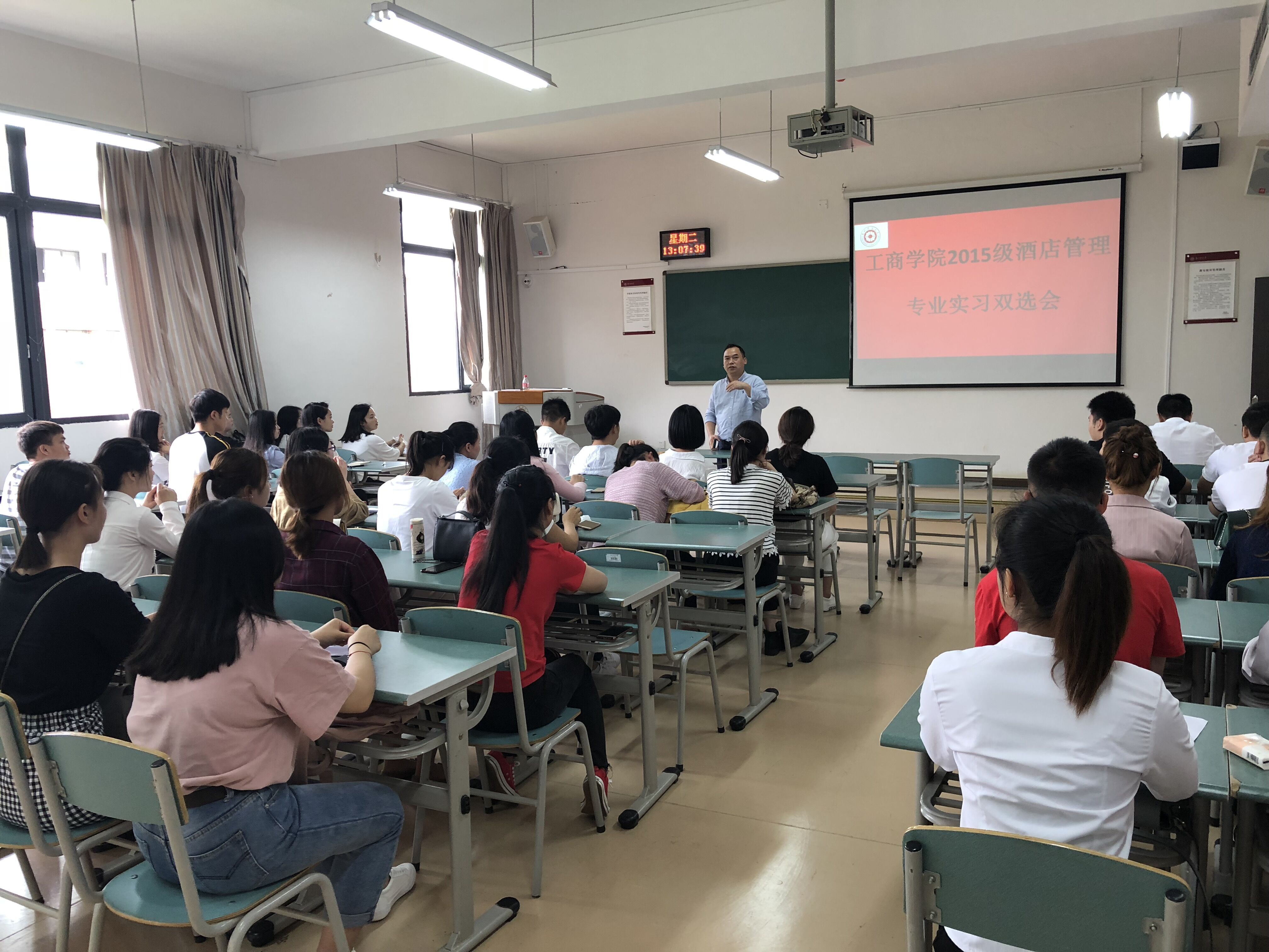 5月29日下午,工商公司在崇德楼四楼举行2015级专业实习动员大会暨双选会。贵阳中天凯悦酒店、贵州群升豪生大酒店、浙江开元酒店集团、贵州省博览局、贵州饭店,大成精舍、桃源河景区等十余家企业参会。工商公司副经理胡北明教授出席,旅游系各副系主任主持,各实习带队教师及2015级旅游系171名员工参加了双选会。