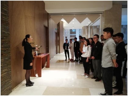 同学们首先参观了酒店,人力资源部工作人员热情介绍了酒店的设计理念、先进的设施、特色等并耐心解答同学们提出的各种问题。通过对酒店客房、酒吧、宴会厅、中餐厅、西餐厅、会议室等的参观,同学们对酒店有了初步的认知。