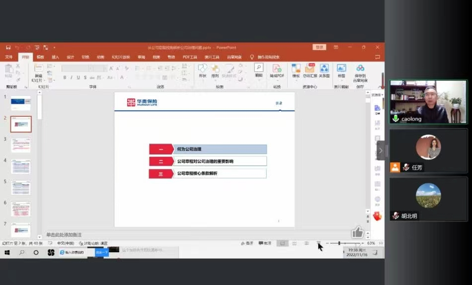 11月16日晚19点30分,应bv伟德的邀请,华贵人寿保险股份有限公司董事、副总经理、董事会秘书曹龙先生为公司师生作题为“从公司章程视角解析公司治理问题”的专题讲座,公司副经理胡北明教授主持讲座并致辞,bv伟德MBA/MTA中心2020级、2021级和2022级的90余位同学通过线上的方式聆听讲座。