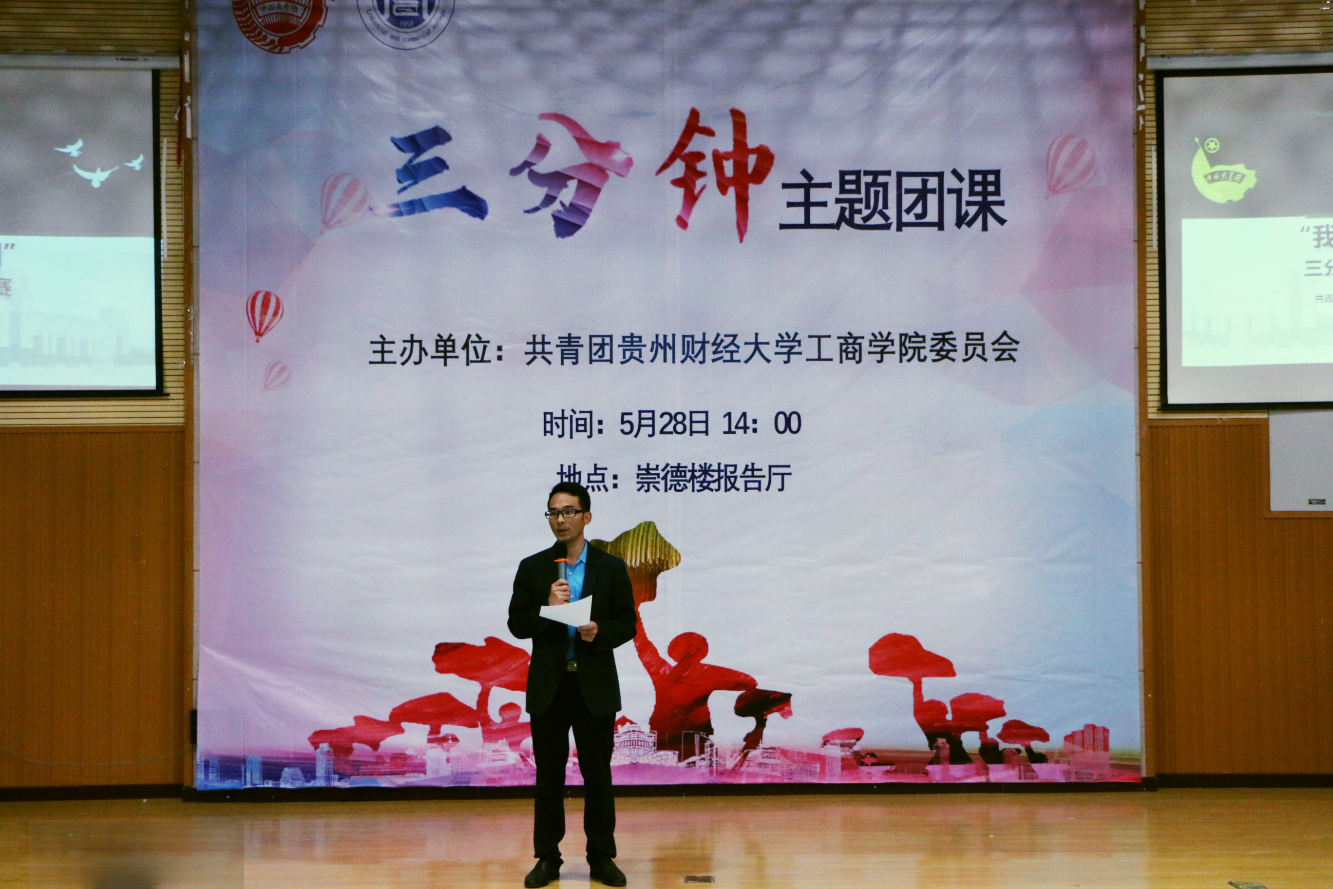 为纪念五四远动100周年及新中国成立70周年,坚持不懈用习近平新时代中国特色社会主义思想构筑青年一代的强大精神支柱,5月28日,工商公司在崇德楼报告厅举办“我和我的祖国”三分钟主题团课活动。校团委书记李文龙、工商公司党委副书记高艳妮、辅导员老师何琴、崔桂美以及160余名青年团员参加了活动。