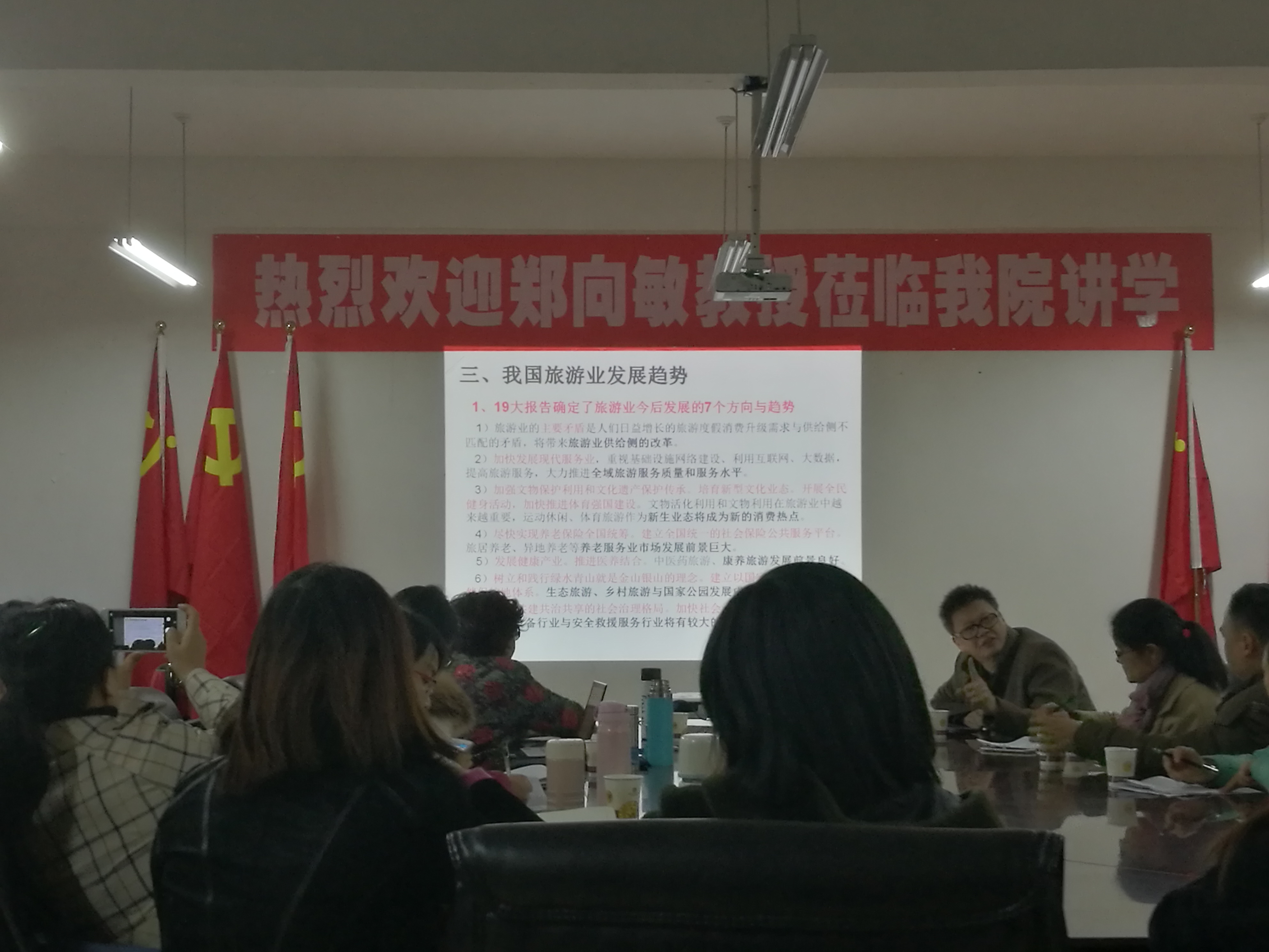 12月27日下午13:30-16:00,在崇德楼306会议室,受工商公司邀请,旅游界知名专家郑向敏教授做了主题为《旅游学术研究前沿和国家社科申报注意事项》的学术交流。会议由胡北明副经理主持,工商公司旅游管理系全体教师和研究生参加。会上,郑教授以我国目前旅游业发展为背景,分析了我国旅游业发展七个新趋势。郑教授强调,国家社科基金旅游类的申报要以党中央十九大报告和国家旅游局“5.15”战略为切入点,注重“旅游+”相关问题研究的思维创新,并针对贵州省大数据、大扶贫、大健康、大旅游等战略,提出与旅游发展相结合的一些选题意见。会后,郑教授积极与2018年预申报国家社科基金的老师进行一对一辅导交流,从社科基金评审要求、注意细节、选题要求、前期成果、团队成员、内容结构等多个方面,给出修改意见。大家教师纷纷表示受益匪浅,机会难得,感谢公司和分院组织这样的学术交流,让自己不断完善社科基金申报材料。