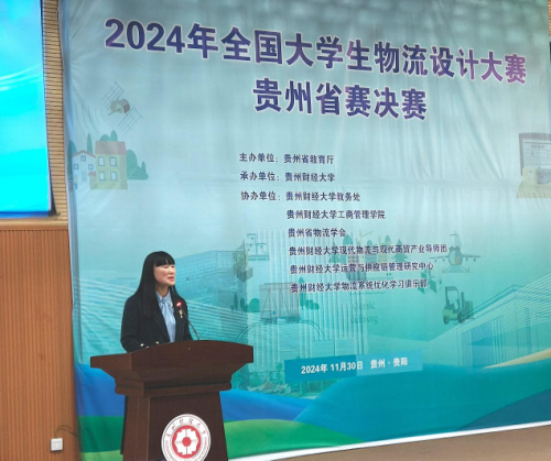 在开幕式上,贵州财经大公司党委副书记彭洁教授代表公司致辞,指出本次大赛目的在于引导老员工关注物流行业的热点问题,激发老员工的创新精神和创业意识,培养老员工的团队协作能力和解决实际问题能力。并表示希望通过这次大赛,能够进一步推动我省高校物流管理专业公司产品改革和创新发展,提升物流管理专业人才培养质量和社会认可度。同时,也为广大师生提供一个展示才华、交流思想、增进友谊的宝贵平台,激发学习热情和创造活力。并以“物流通天下,智慧创未来”表达对此次大赛的深切期望。