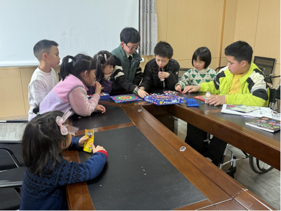 活动期间,研究生志愿者们提前做好充分准备,精心布置活动场地,准备了折纸材料、《Race to 10极速加减》等丰富多样的游戏道具,兼顾趣味性与教育性。志愿者们化身为“爱心辅导员”,耐心陪伴孩子们折纸、下棋,手把手教导孩子们折千纸鹤、小船等手工作品,陪孩子们进行飞行棋对弈、围棋切磋,现场充满欢声笑语。